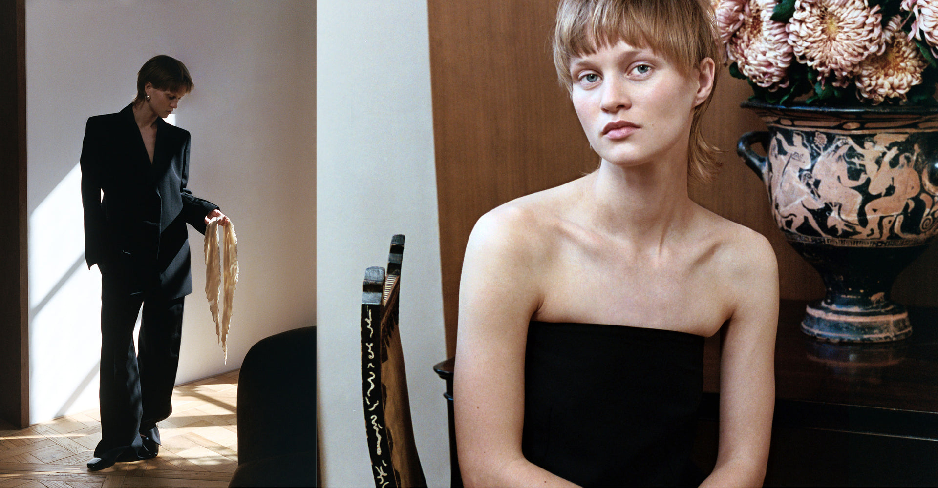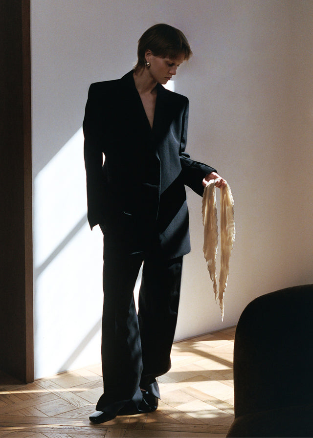 Un traje oversize tomado del armario masculino se combina con un vestido bustier de lana de líneas depuradas. La piel de lana abriga el cuerpo, los cueros brillan en un verde oliva intenso o en negro lacado. El punto fino se desliza suavemente sobre la piel. Los zapatos de tacón Théa en color marfil, el bolso Suzanna en charol y el pañuelo de seda plisado completan este look sofisticado y sobrio.