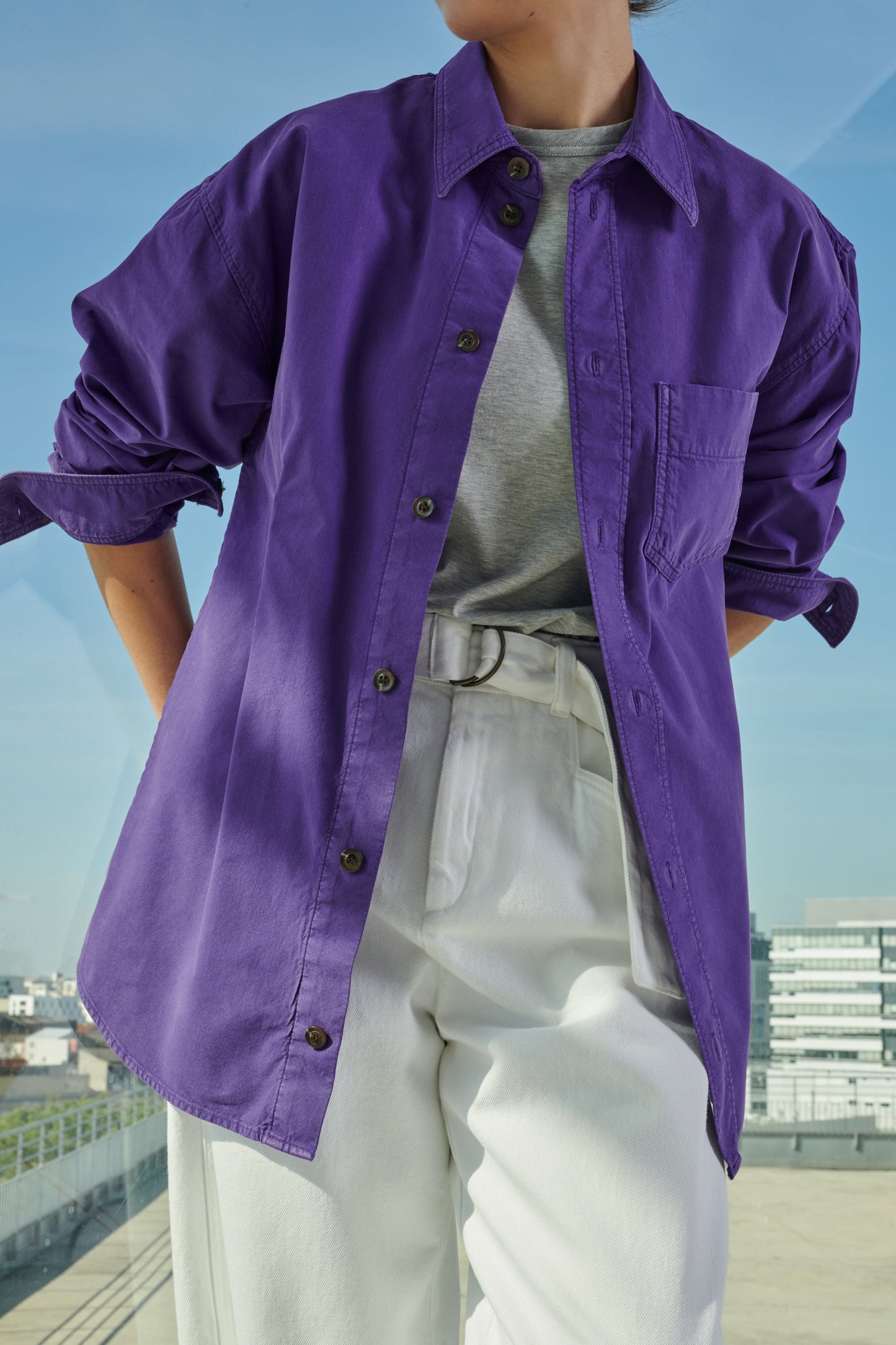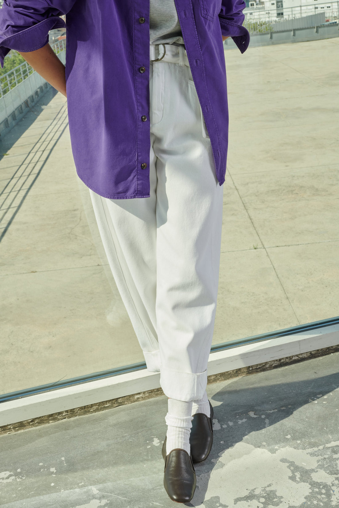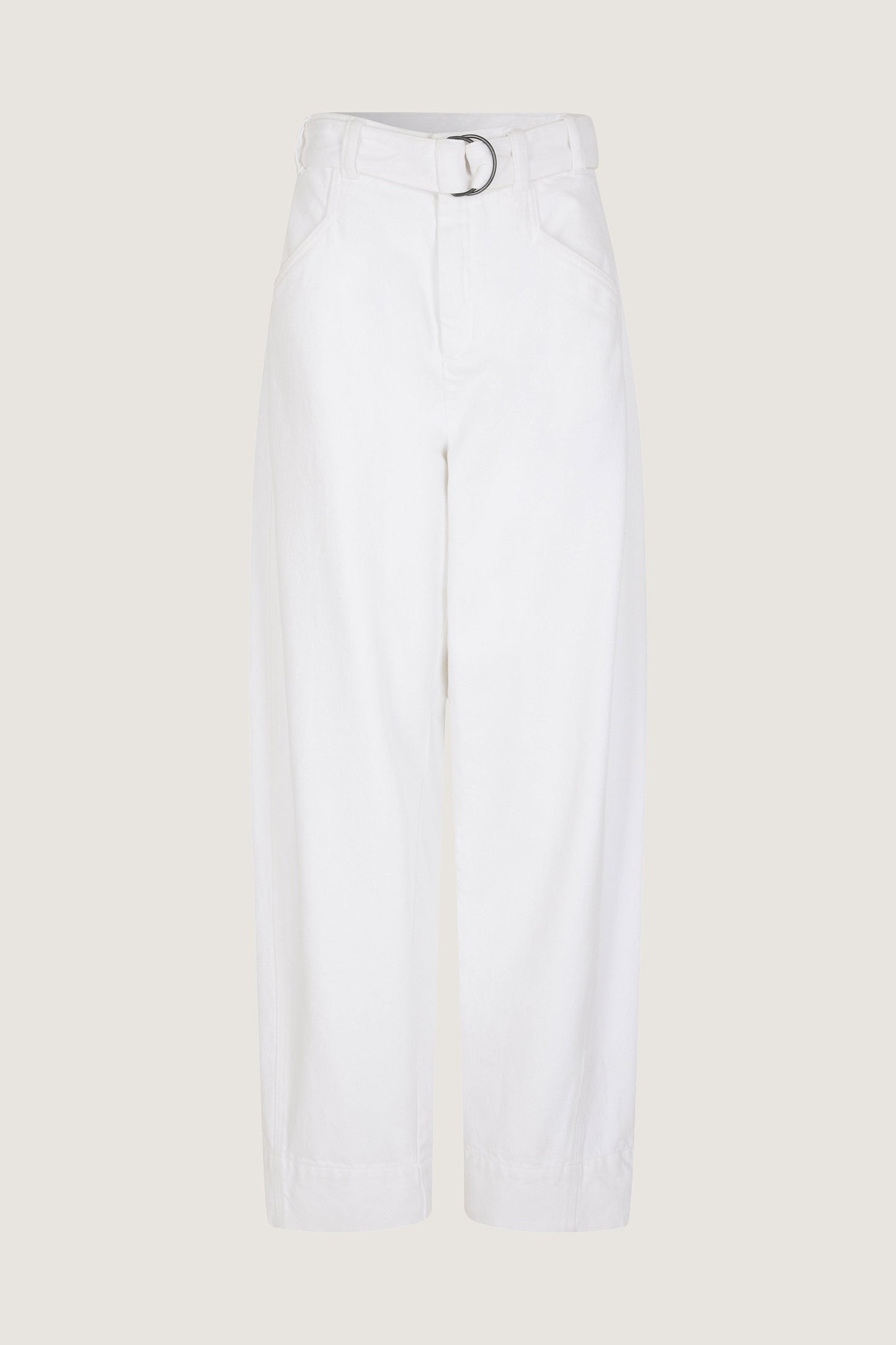 Pantalón de cintura alta con cinturón de tejido vaquero blanco - Corte ligeramente redondeado- Cinturón desmontable con doble hebilla- Dos bolsillos traseros de parche- Cierre con corchete en el interior del cinturón