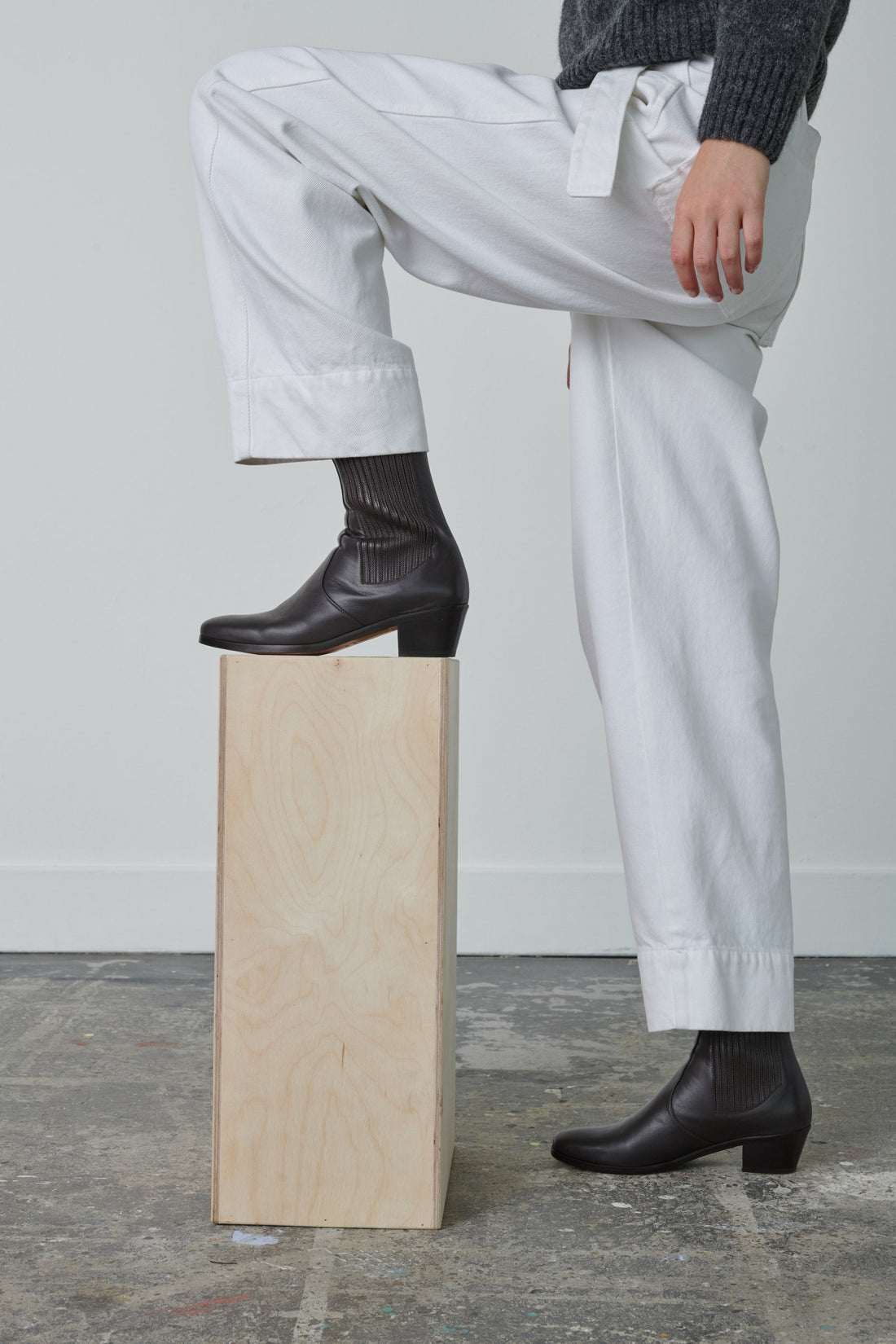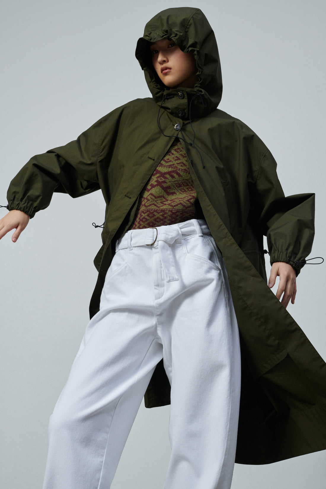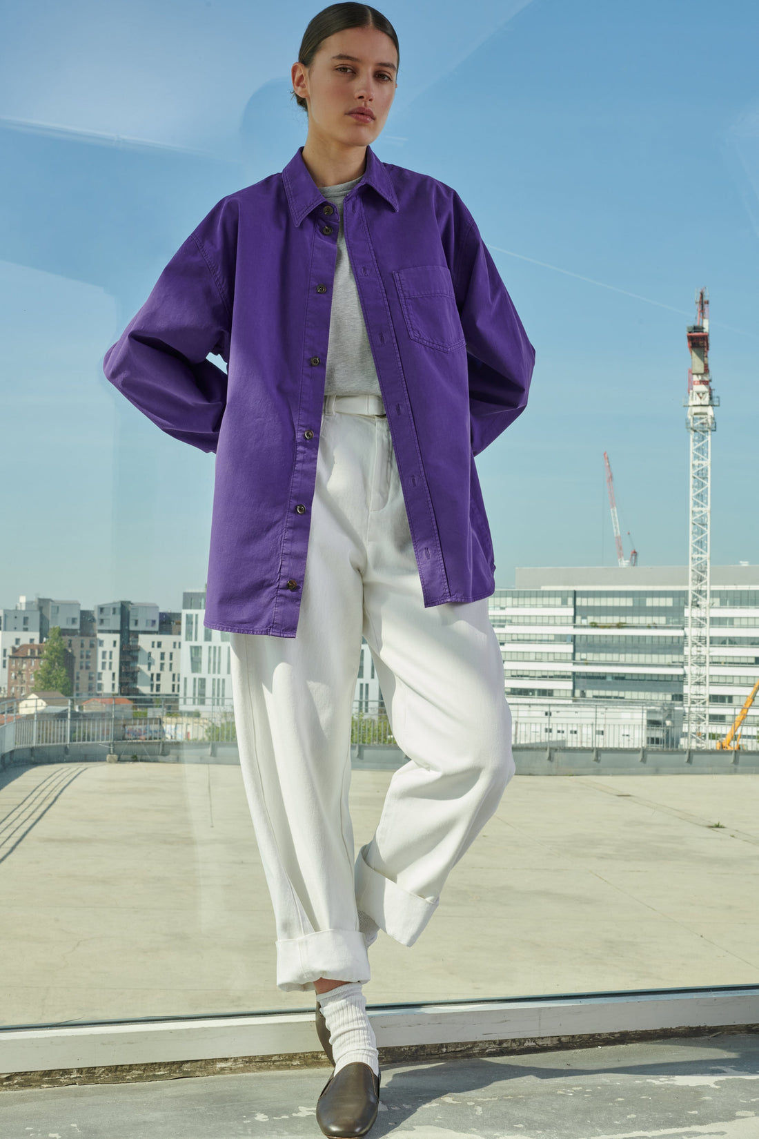 Pantalón de cintura alta con cinturón de tejido vaquero blanco - Corte ligeramente redondeado- Cinturón desmontable con doble hebilla- Dos bolsillos traseros de parche- Cierre con corchete en el interior del cinturón