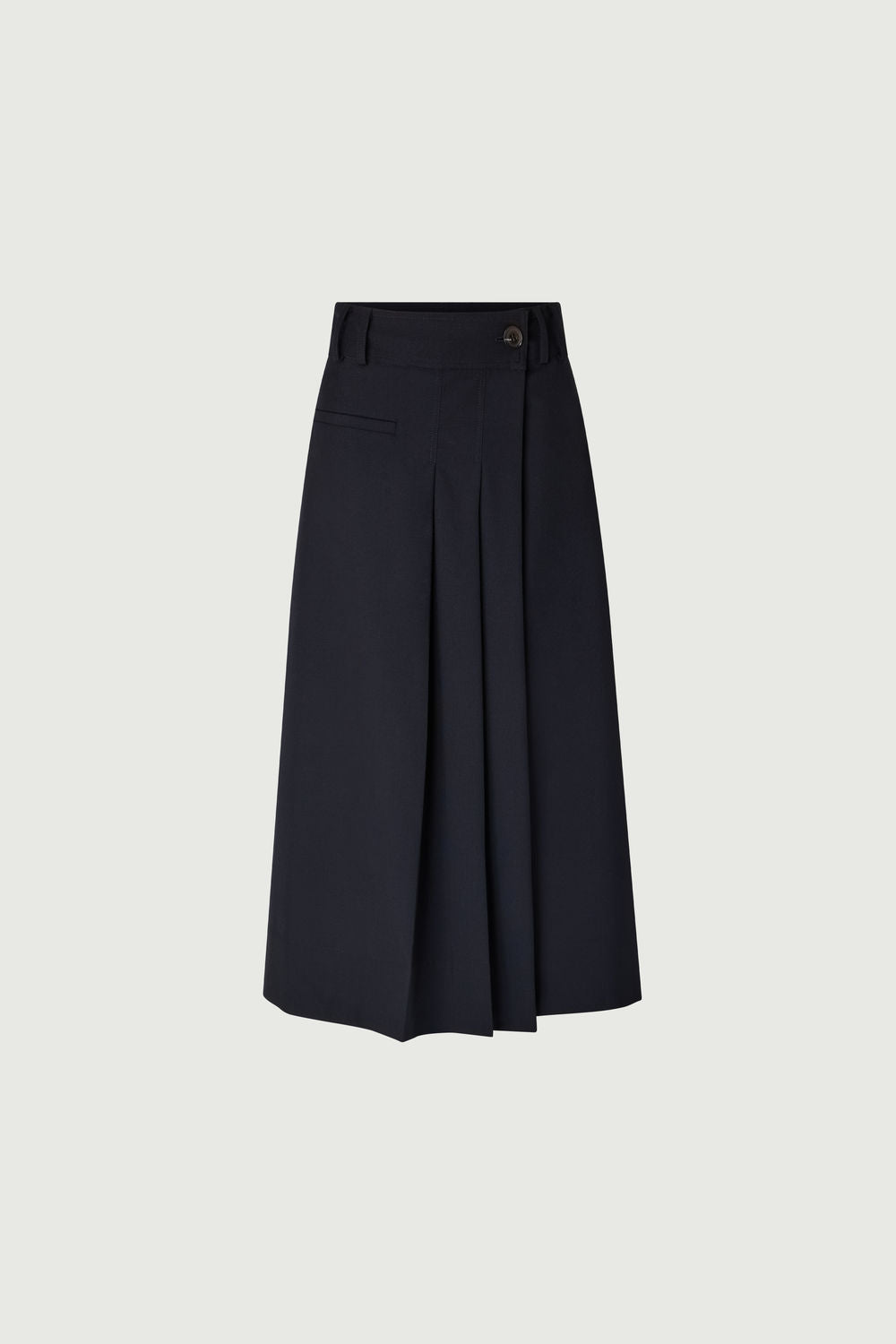 VARNA es una falda de tela de lana azul marino. Inspirada en el estilo tradicional del kilt, esta falda se distingue por sus pliegues cuidadosamente diseñados en la parte delantera, que crean un movimiento fluido y refinado.