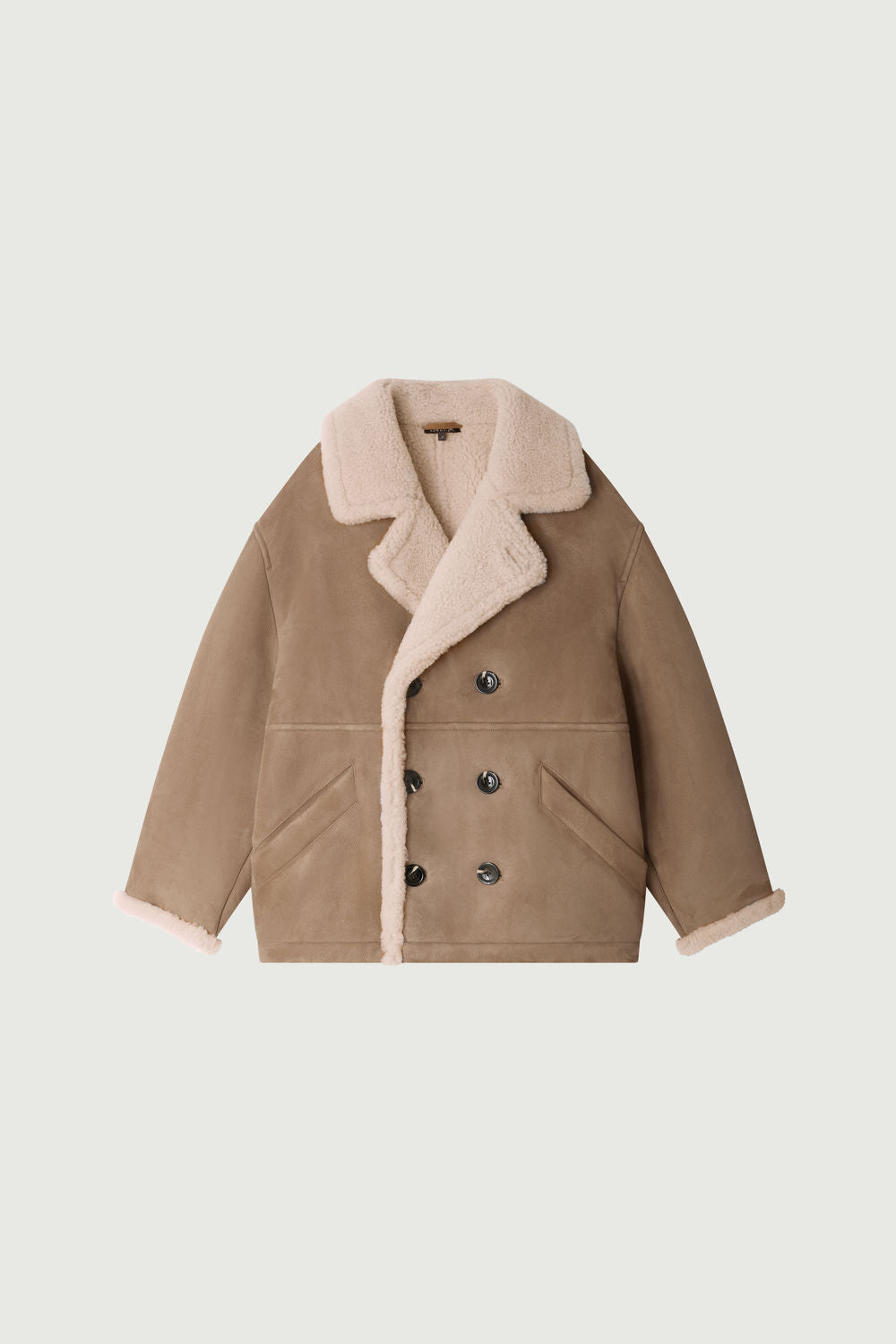 BONN es un abrigo de piel de oveja beige. Su volumen amplio y corto se cierra con un doble abotonado. Confeccionado en cuero de cordero ante, asegura una protección óptima contra el frío mientras ofrece una suavidad excepcional con su interior de piel de oveja.