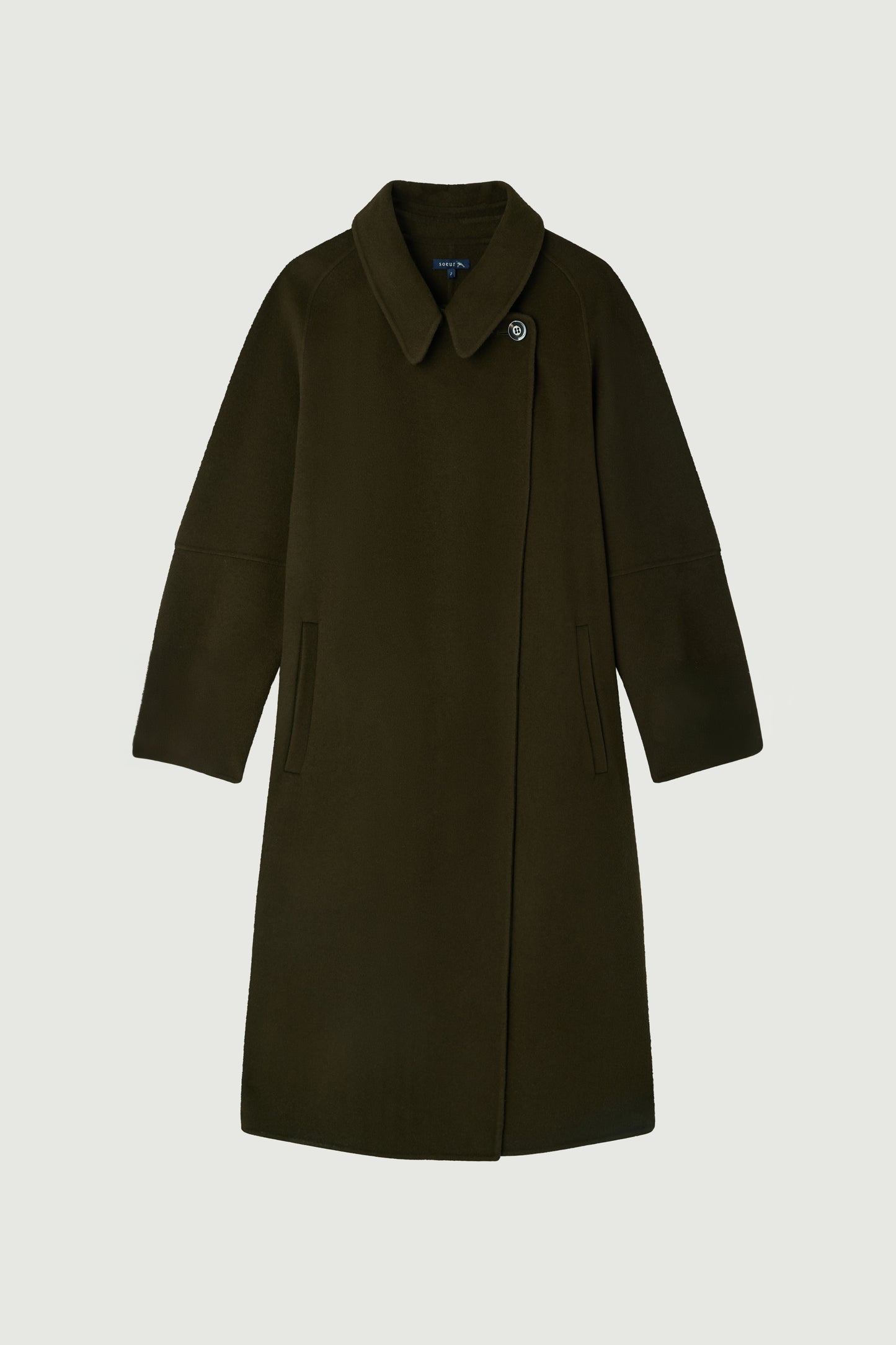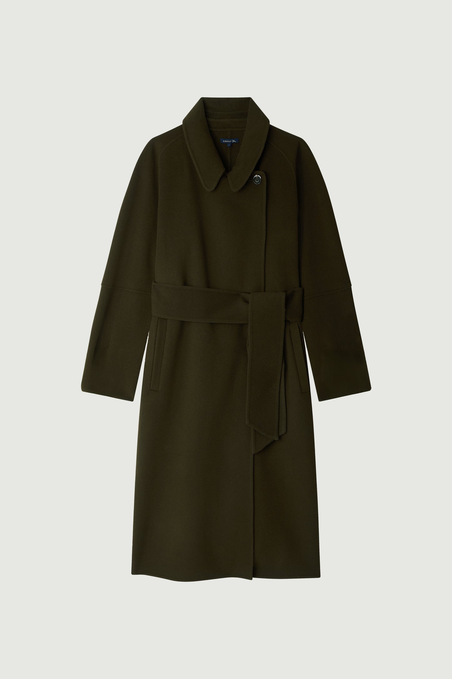CHAMBERY es un abrigo largo con volumen que sigue la silueta, confeccionado en lana de doble faz en un tono de caqui oscuro. Dispone de un cuello extraíble con botones y se cierra con un cinturón extraíble para un ajuste perfecto. En un espíritu minimalista, las costuras ocultas resaltan el corte sofisticado y atemporal.