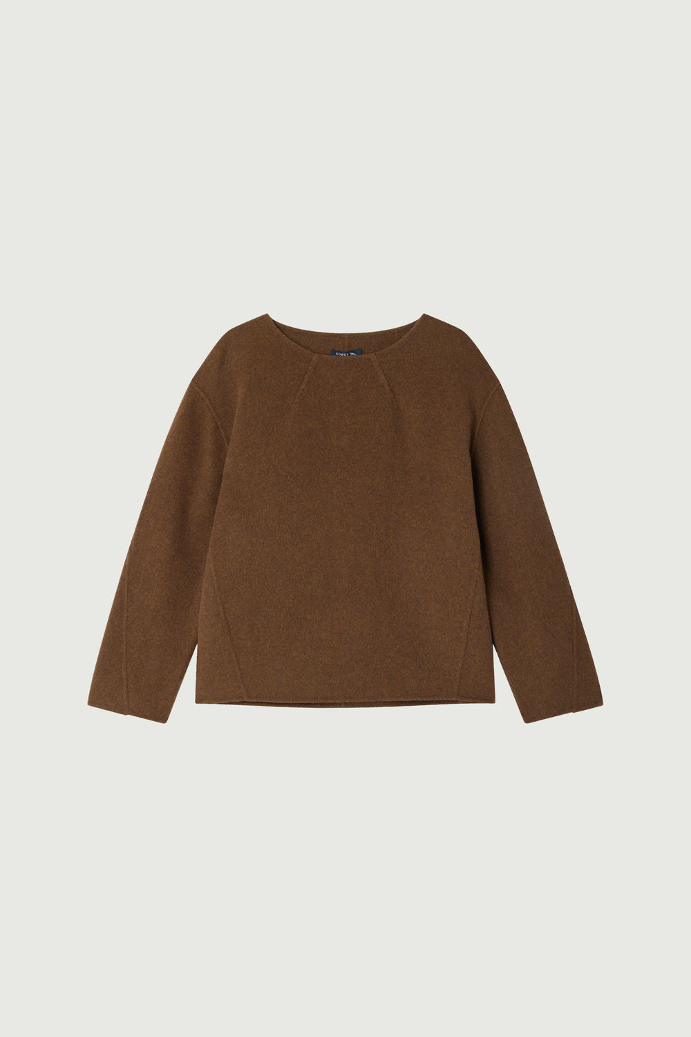 AMEDEE es un jersey corto y holgado de tejido de lana cálido. Se distingue por detalles de pinzas en la parte inferior del cuerpo y en las mangas que refuerzan su corte redondeado. La lana de doble faz es particularmente aislante, mantiene mucho calor al mismo tiempo que es flexible y suave.
