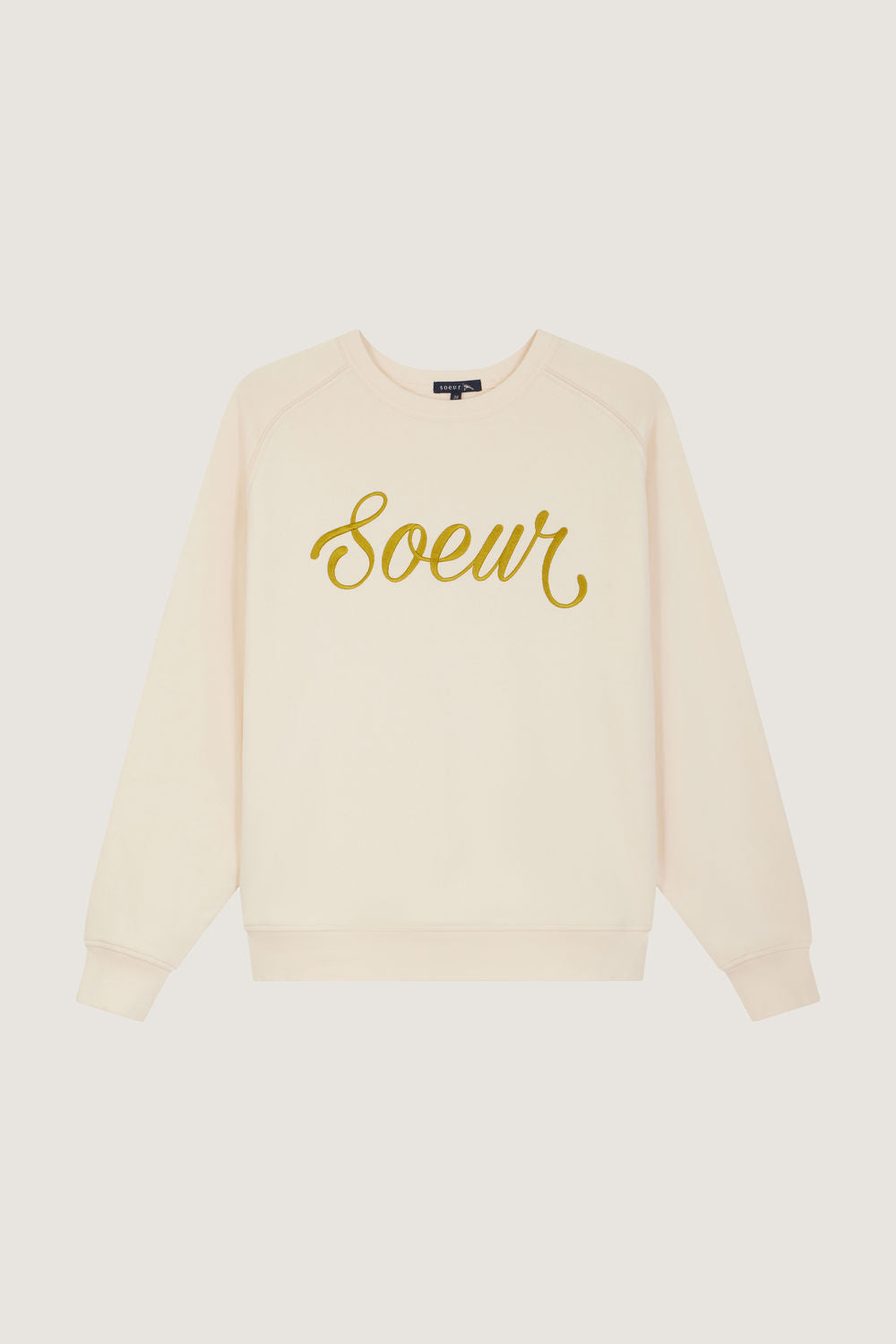 - Inscripción "Soeur" bordada en verde anís